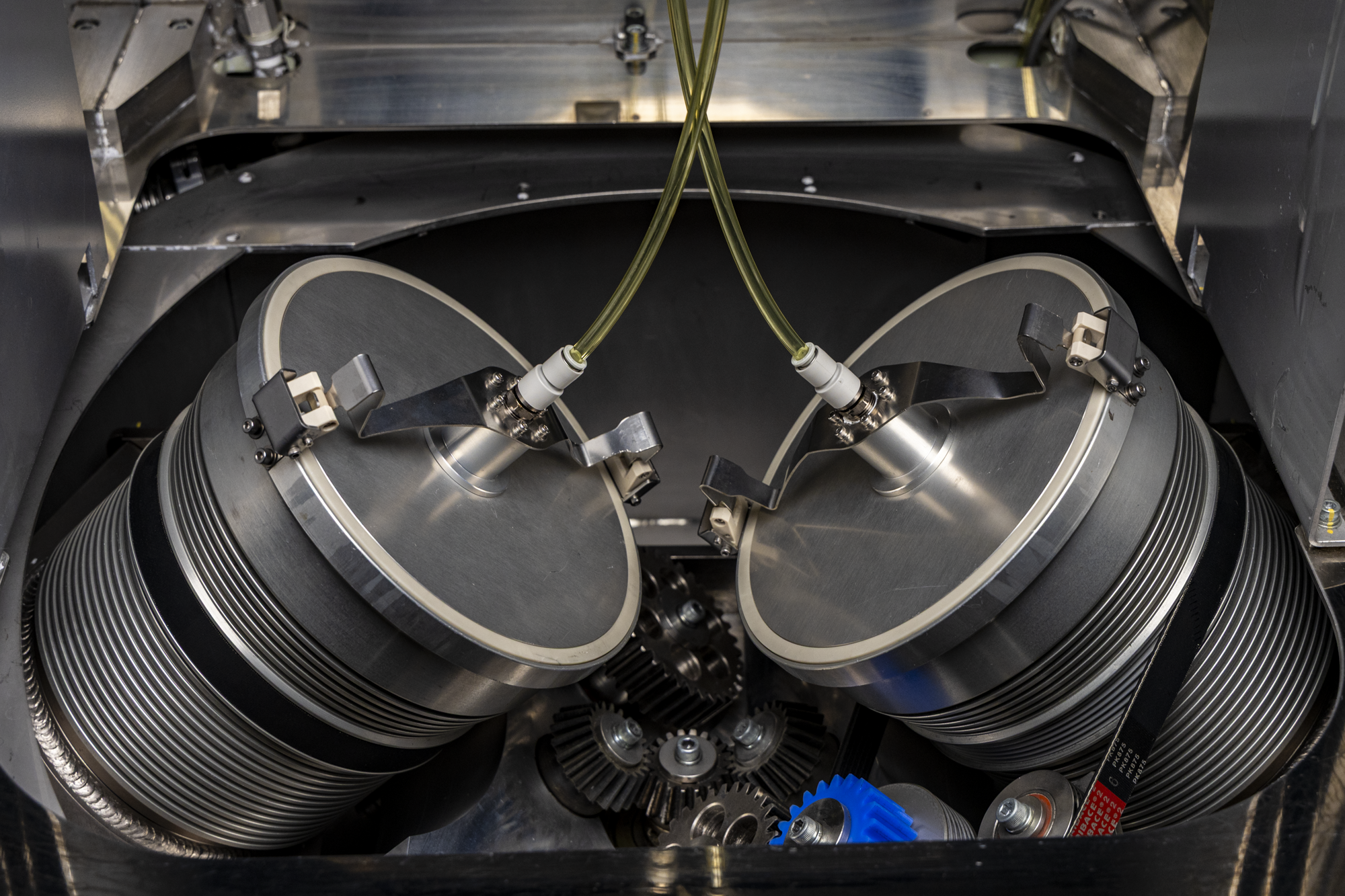 The container spins around its axis, generating smooth interna material flow for efficient dispersion without excessive shear.